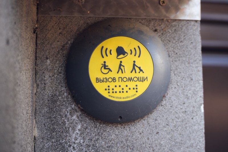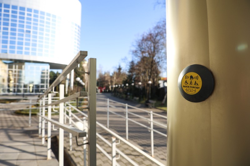 Вход в здание корпуса оборудован кнопкой вызова помощника.