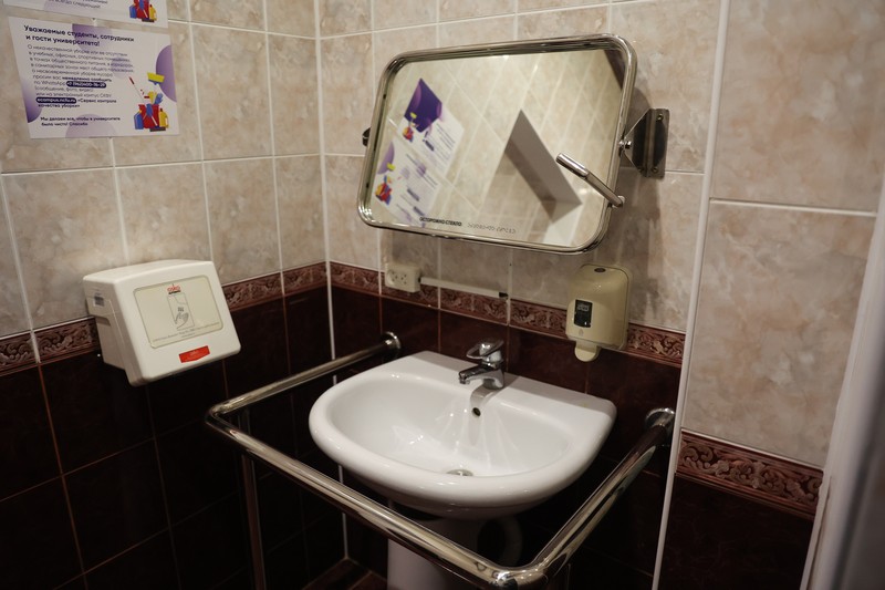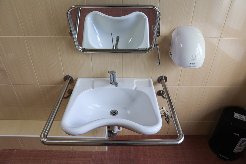 Санузел для лиц с ОВЗ оборудован поручнями вокруг раковины. Зеркало имеет поворотный механизм и ручку настройки угла отражения, доступную для инвалида колясочника.