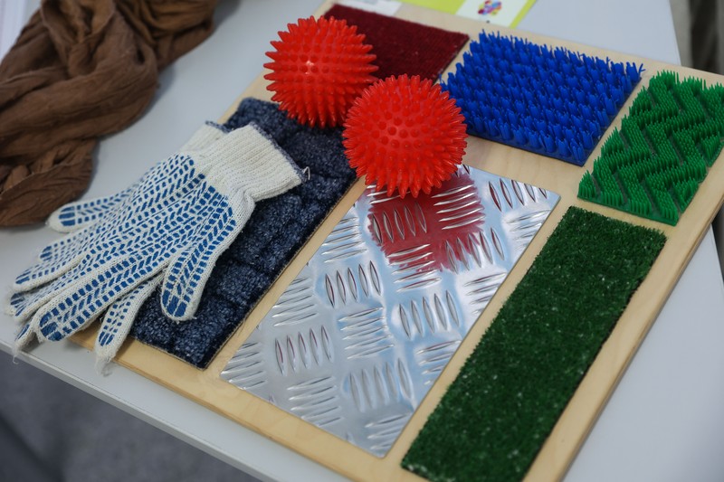 На интерактивной площадке используются реальные материалы, наглядные пособия и инструменты, применяемые в ежедневной жизнедеятельности людьми с инвалидностью. Например, тактильная панель «Текстуры», позволяющая погрузиться в мир нарушений тактильной чувствительности.