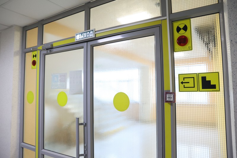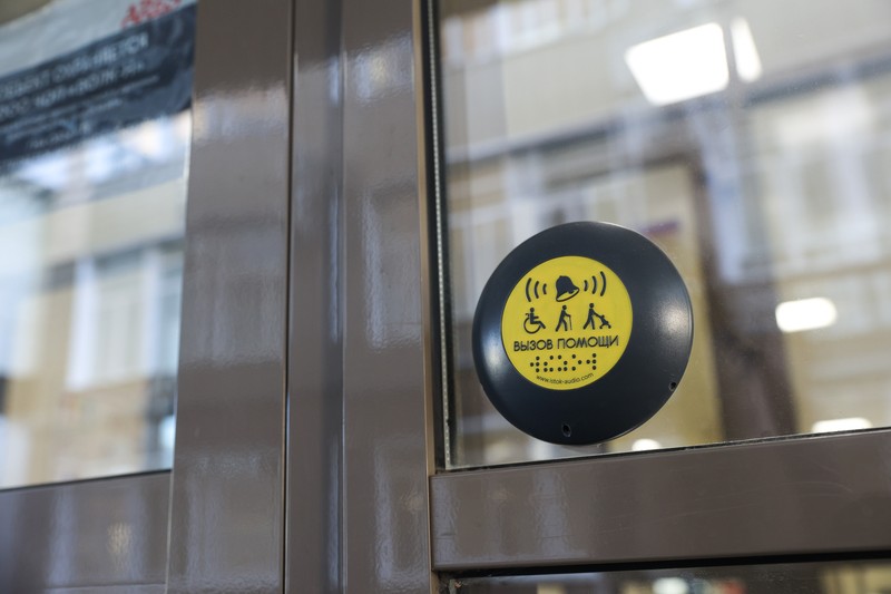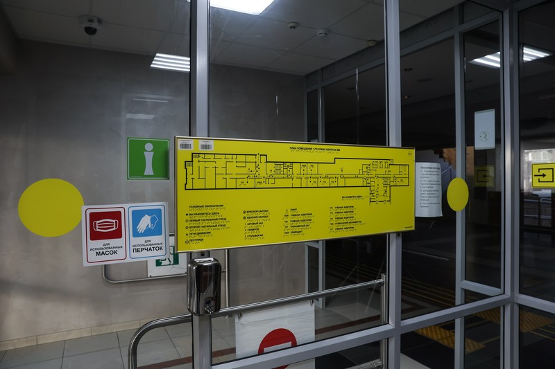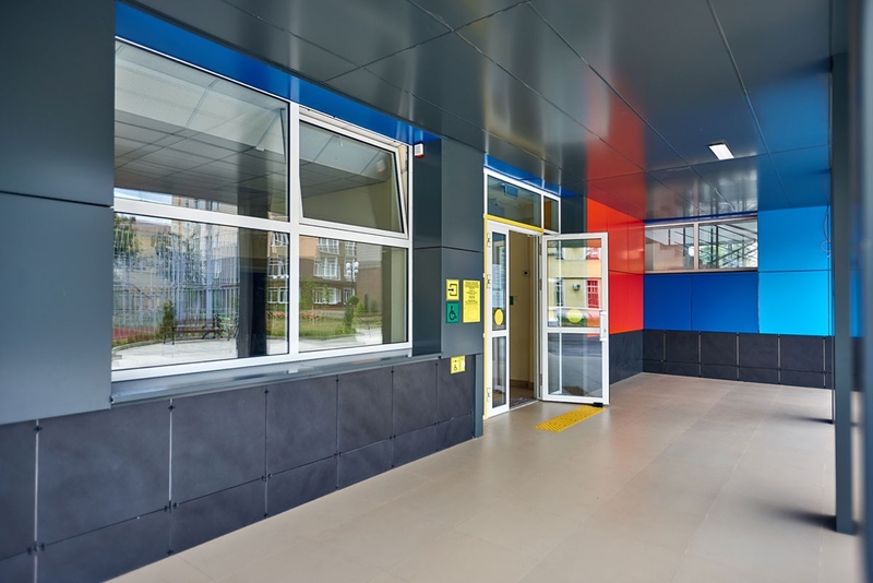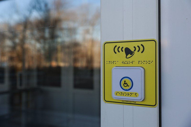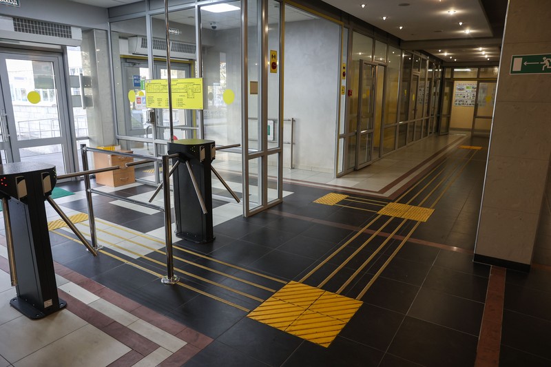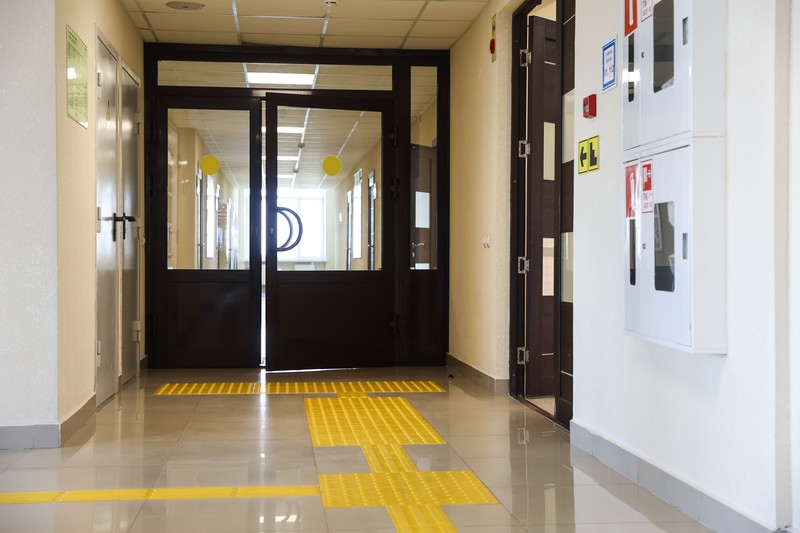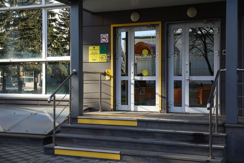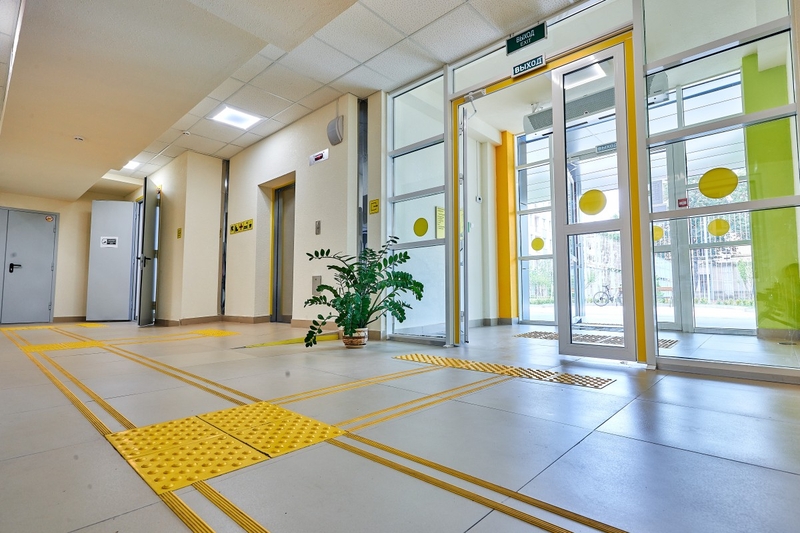 Вход в корпус оборудован тактильной табличкой со шрифтом Брайля и дверью с контрастно окрашенной поверхностью, для идентификации дверного проема слабовидящим и человеком с когнитивными ограничениями предусмотрены желтые круги на стекле.