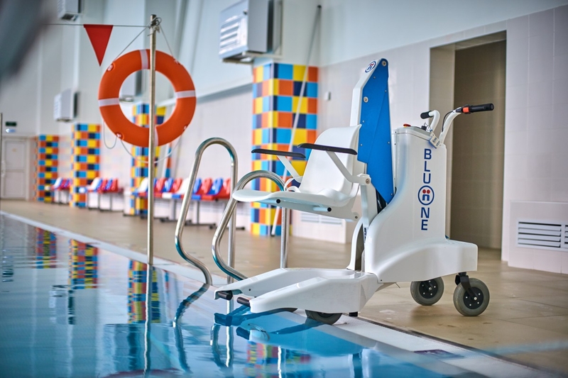 Подъемник позволяет человеку с ограниченным возможностями и инвалиду преодолеть расстояние между раздевалкой и бассейном, после чего его безопасно опустят в воду.
