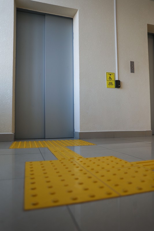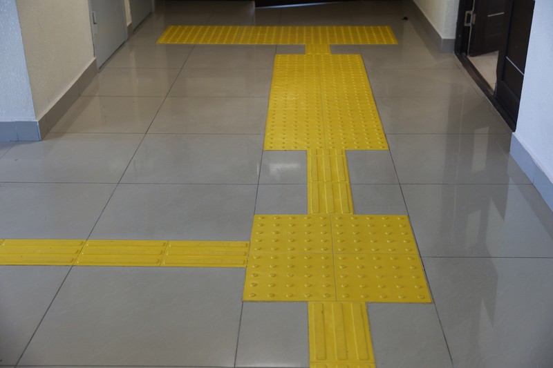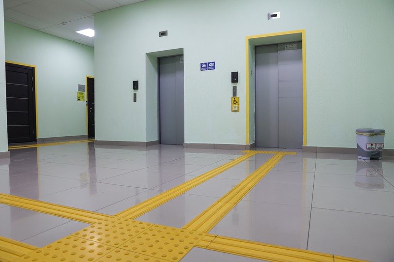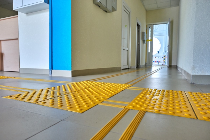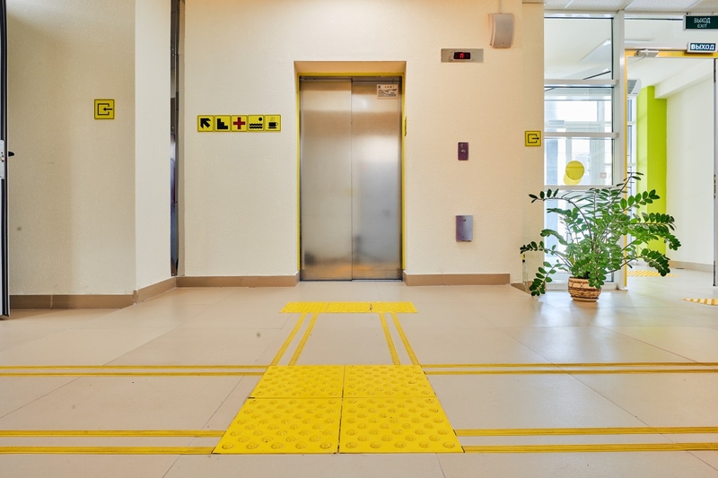 Для легкой идентификации направления движения внутри корпуса для всех категорий людей, включая с нарушением зрения, на полу расположены тактильные направляющие.
