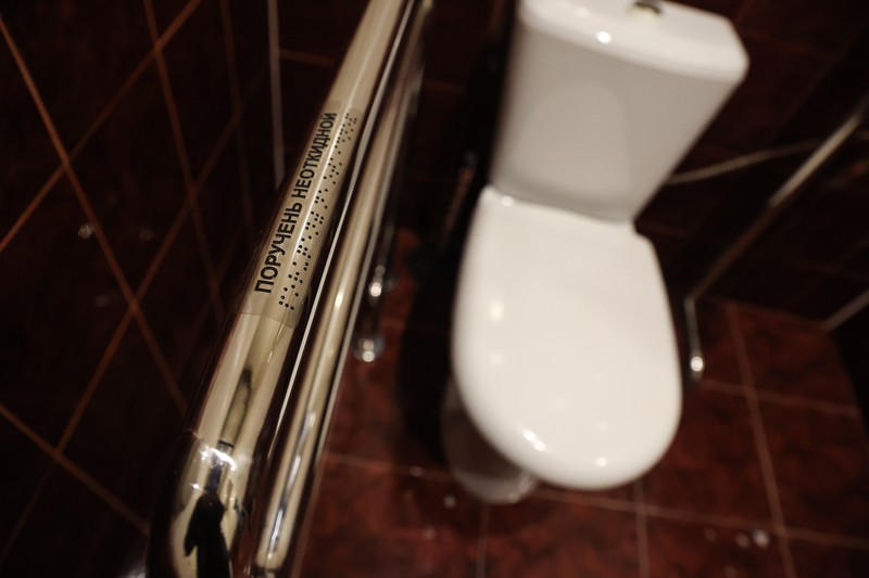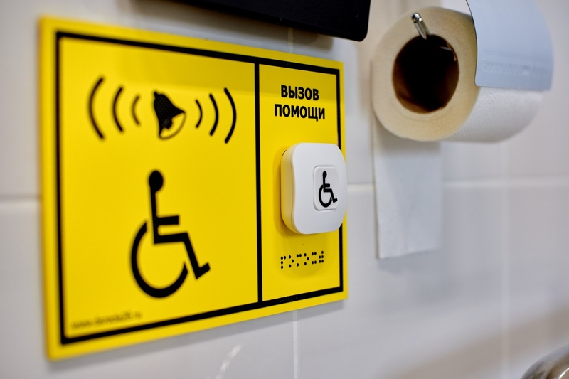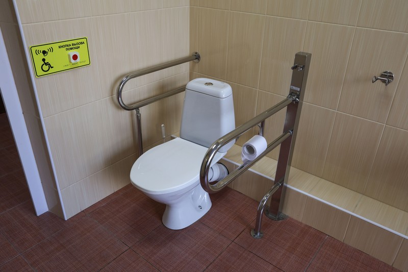 Санузел оснащен широким дверным проемом, достаточной площадью и специальными поручнями (для удобства лиц с нарушениями ОДА), тактильными табличками и обозначениями на поручнях и зеркалах (для лиц с нарушениями зрения), кнопкой вызова помощника (для всех нозологий).