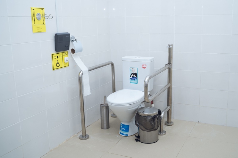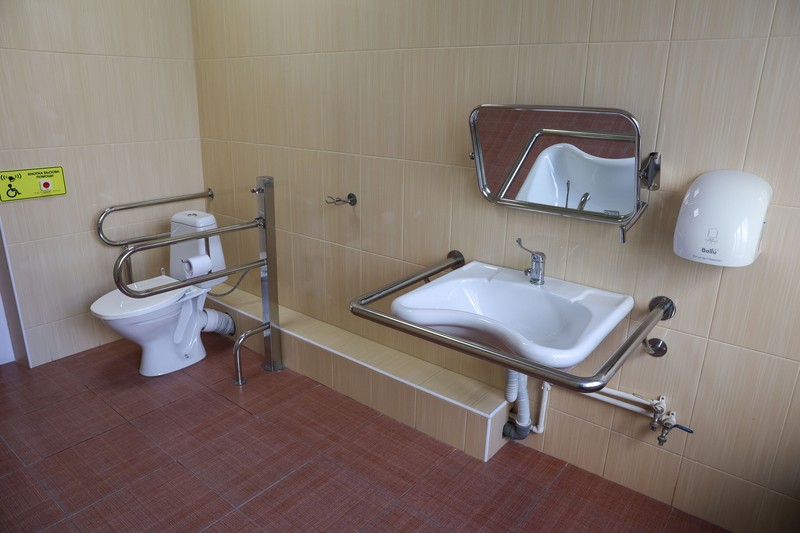 Туалет для инвалидов отвечает требованиям безопасности. Поверхность пола нескользкая, поворотные прочные поручни и перила позволяют пользоваться санузлом достаточно комфортно. Есть возможность принятия душа, все функции доступны из положения сидя.