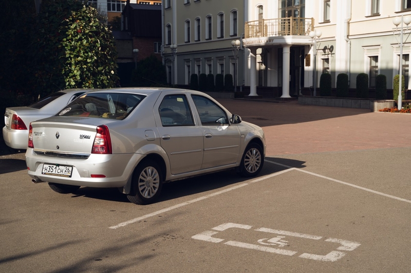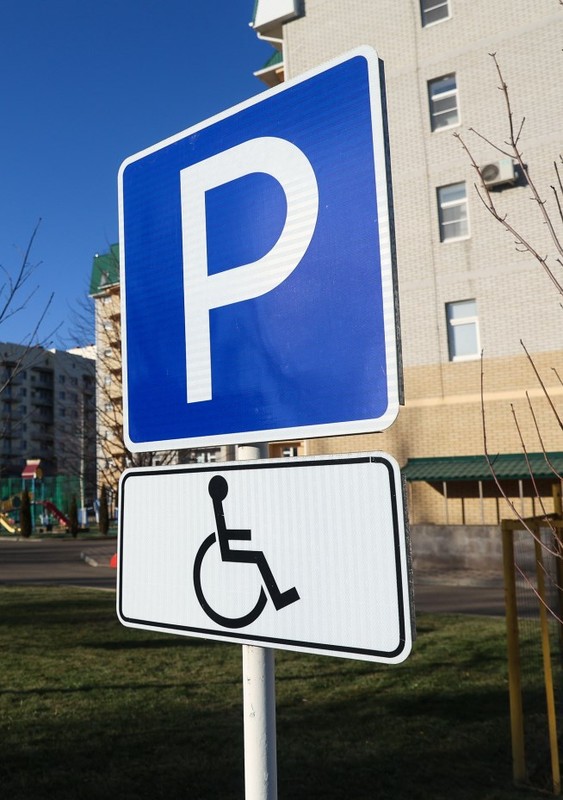 Территория парковочных мест для лиц с ОВЗ возле корпуса обозначена специальной дорожной разметкой, которую дублирует знак.