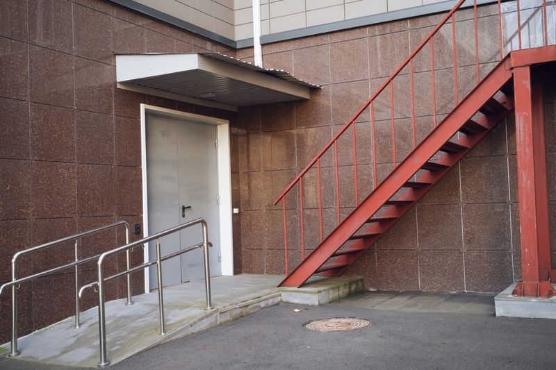 Запасные входы корпуса также оборудованы для возможности посещения людьми с ОВЗ, имеется пандус, поручни и тактильные указатели контрастных цветов.