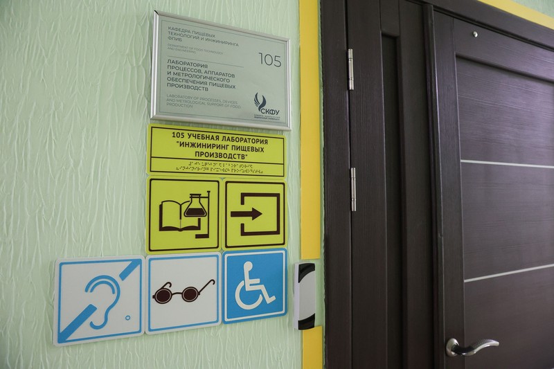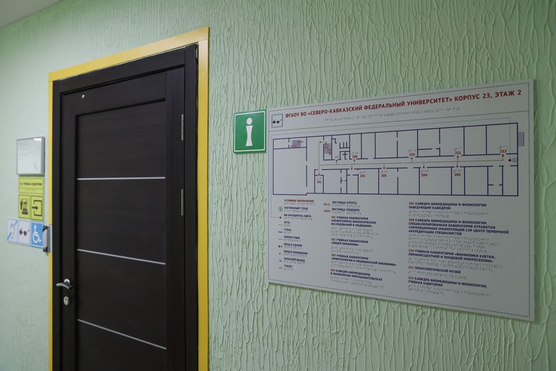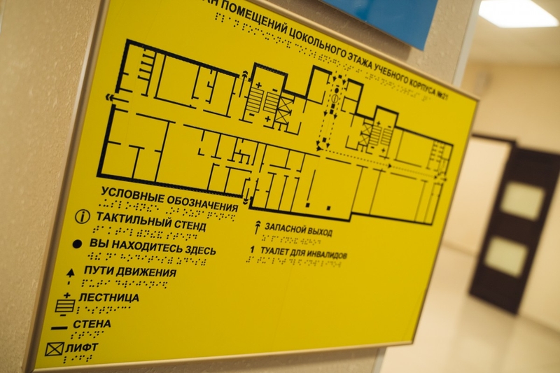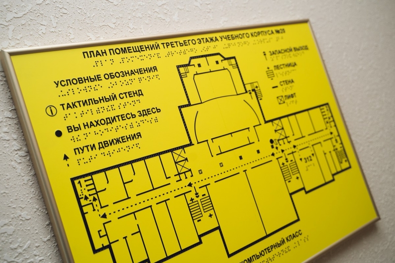Таблички с названием аудитории, а также схема кабинета оснащены инкрустированным шрифтом по системе Брайля. Дверные проемы имеют контрастную полосу по контуру и являются средством ориентирования для людей с ослабленным зрением.