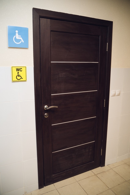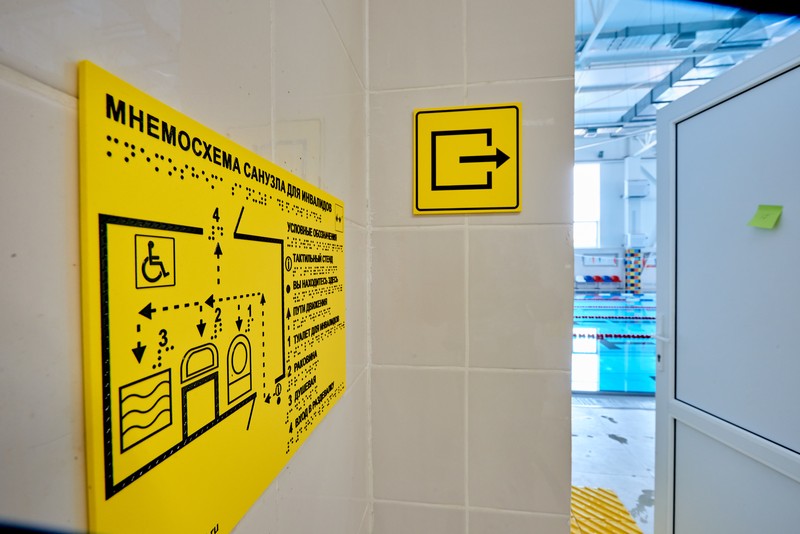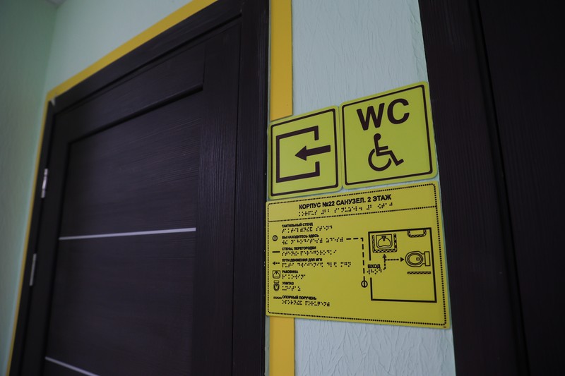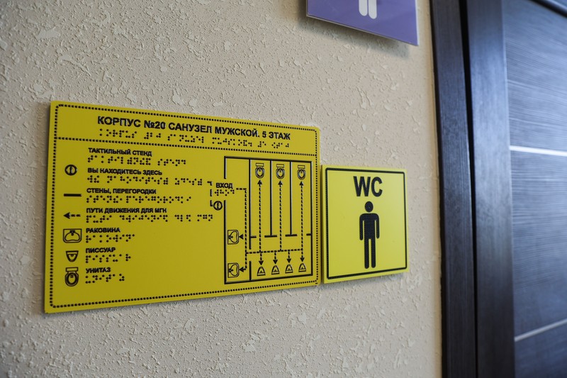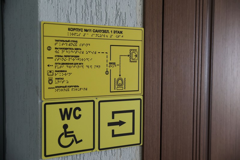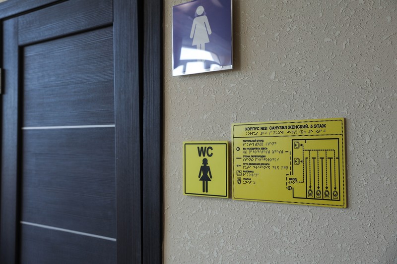 Для людей со слабым зрением санузлы на входе оборудованы тактильными табличками, облегчающими навигацию внутри помещения.