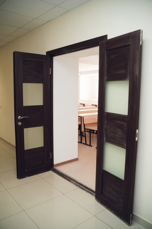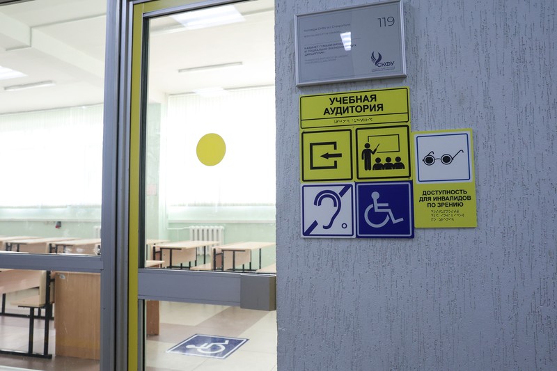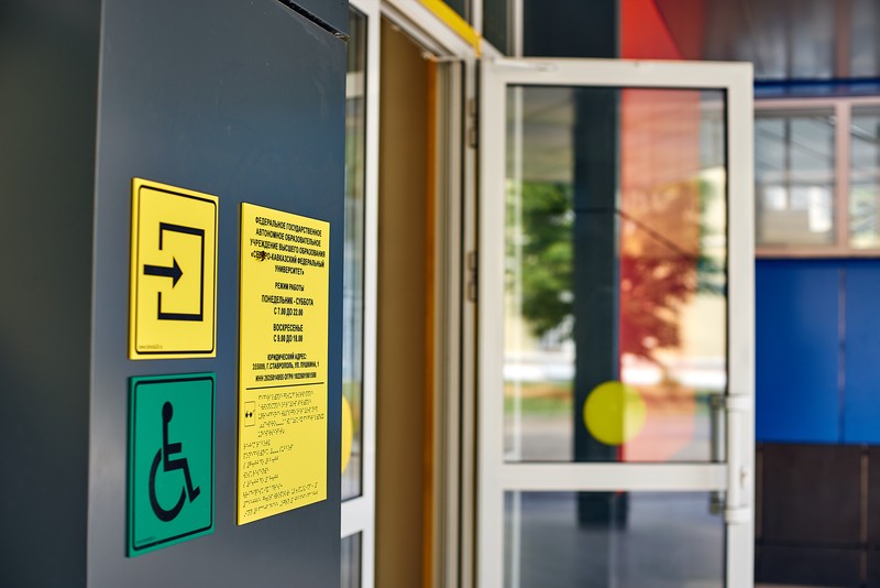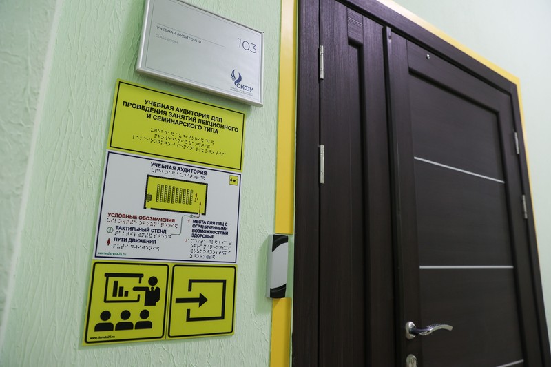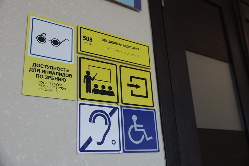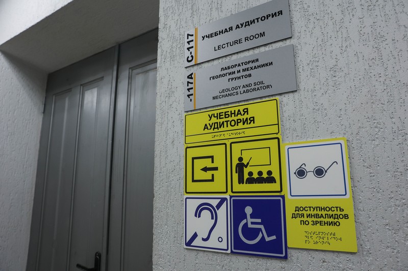 Таблички с названием аудитории оснащены инкрустированным шрифтом по системе Брайля. Дверные проемы имеют контрастную полосу по контуру и являются средством ориентирования для людей с ослабленным зрением.