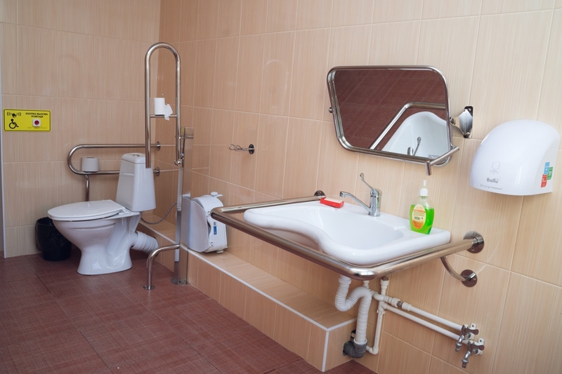 Туалет для инвалидов. Маломобильные группы граждан имеют трудности с выполнением обычных действий. Для их решения используются специальные перила и поручни, которые обеспечивают необходимую поддержку и опору при посещении санузла. Ширина помещения позволяет легко маневрировать на коляске.