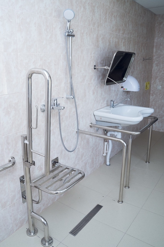 Ширина помещения позволяет легко маневрировать на коляске. Также санузел оборудован специальной кнопкой вызова персонала. Душевой уголок специально сделан для возможности принятия душа инвалидами. Снабжен поручнями и легким креслом, изменяющим высоту ножек.