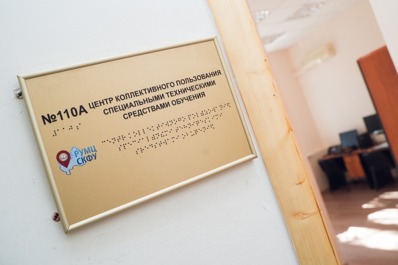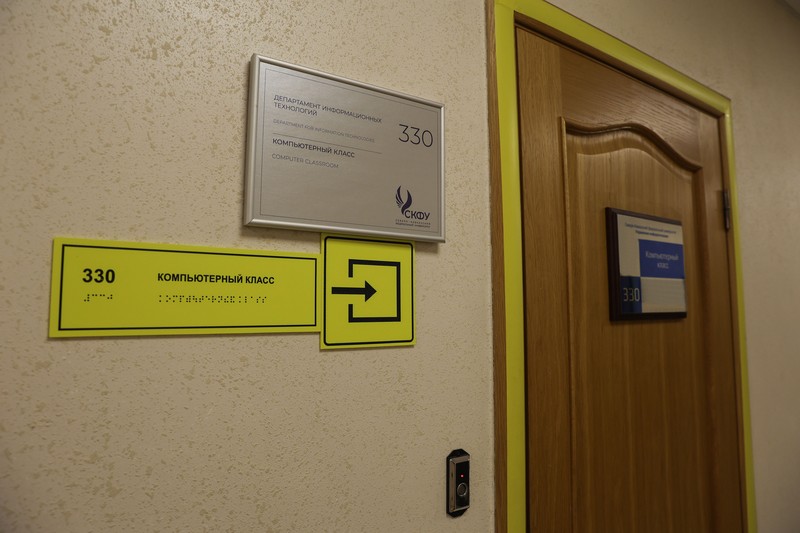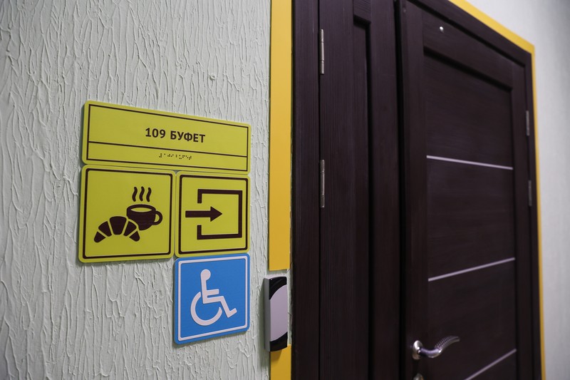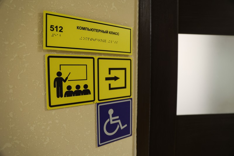 Таблички с названием аудитории оснащены инкрустированным шрифтом по системе Брайля.