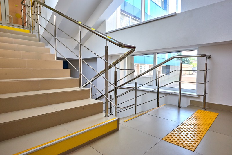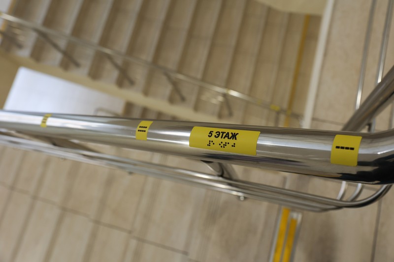 Для обеспечения безопасного движения незрячего человека по лестничным маршам на поверхности поручней корпуса имеются рельефные обозначения о начале и окончании лестничного марша. Первая и последняя ступеньки марша также имеют контрастную ленту.