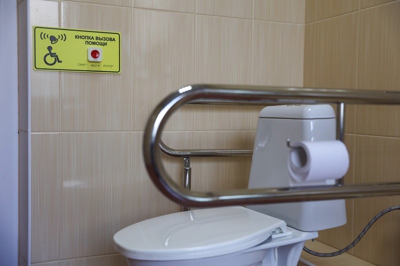 Санузел для лиц с ОВЗ оснащен специальной кнопкой вызова помощи персонала в случаях возникновения экстренной ситуации.