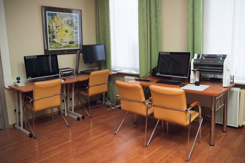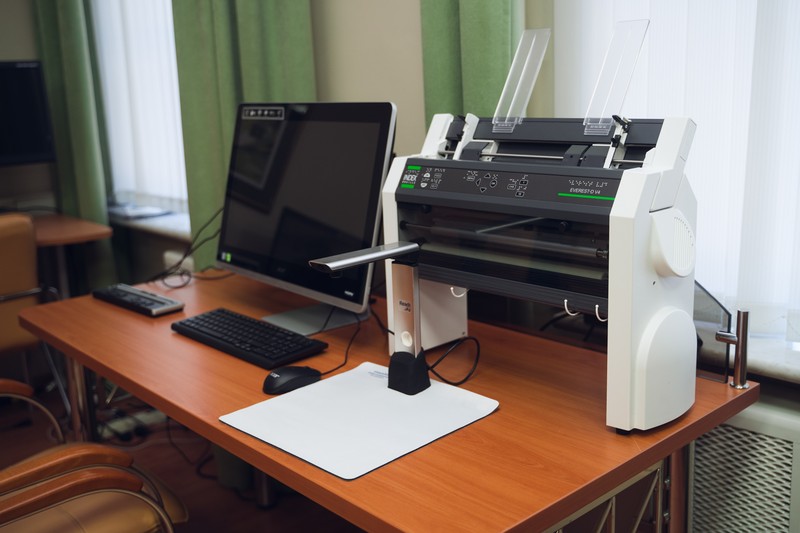 Рабочее место в библиотеке включает устройства ввода и вывода информации для лиц с нарушениями зрения. Дисплей Брайля – устройство ввода информации посредством шрифта брайля (для лиц с нарушениями зрения). Стационарно с возможностью перемещения. Принтер для печати рельефно-точечным шрифтом Брайля (Index Everest) – устройство вывода информации (в комплекте с ПО (DBT), ПК, специальной бумагой) для лиц с нарушениями зрения, владеющих азбукой Брайля (чтение, письмо). Выводит текст шрифтом брайля. Стационарное устройство с возможностью перемещения. Универсальное цифровое устройство для чтения, прослушивания и управления информацией (Zoom Text Image Reader) – электронное устройство преобразования текста в речь, предназначенное для лиц с нарушением зрения (читающая машина). Стационарное устройство с возможностью перемещения.