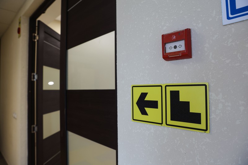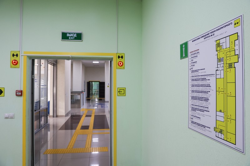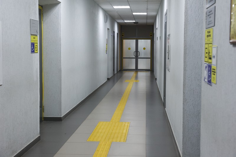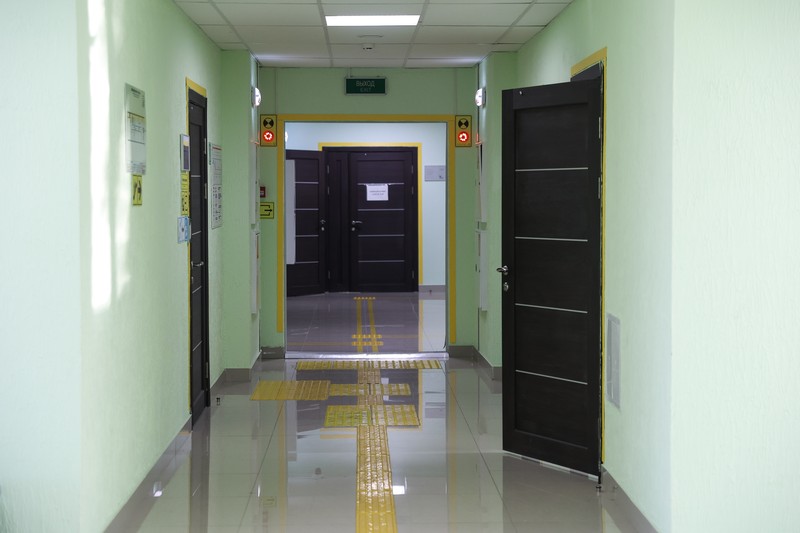 Коридоры корпуса оборудованы тактильными табличками на стенах и рельефно-выпуклым полимерным слоем на полу для информирования незрячих или слабовидящих по ходу движения. Дверные проемы имеют по контуру желтую ленту и световые маячки.