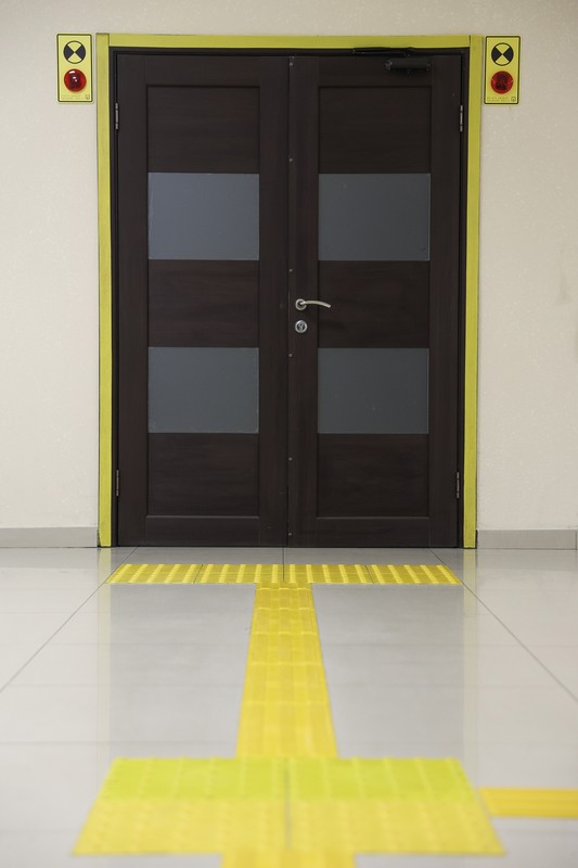 Дверные проемы имеют контрастную полосу по контуру, оснащены предупредительной тактильной разметкой. Также рядом с дверным проемом расположены справа и слева световые маяки, которые для инвалидов по зрению служат для обозначения габаритов дверного проема помещения и являются отличным средством ориентирования.