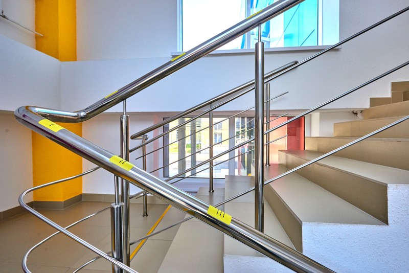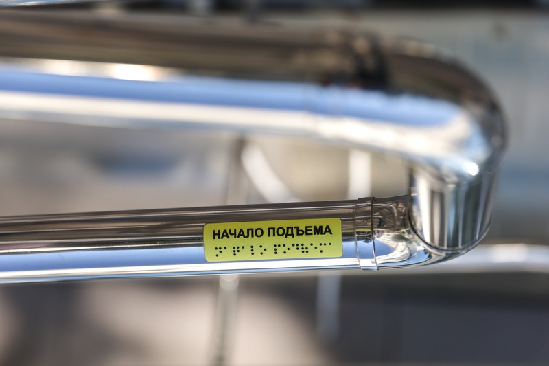 Для обеспечения безопасного движения незрячего человека по лестничным маршам на боковой поверхности поручней имеются рельефные обозначения о начале и окончании лестничного марша. Ступеньки начала и конца марша также обозначены контрастной выпуклой лентой на металлическом основании.