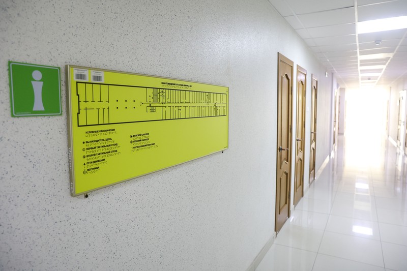 Коридоры корпуса оборудованы контрастными тактильными табличками с рельефно-выпуклым полимерным слоем для информирования слепых и слабовидящих.