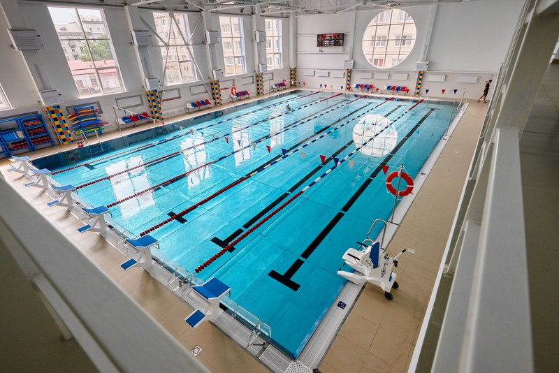 Бассейн оборудован тактильными указателями и имеет в наличии специальный подъемник для инвалидов-колясочников и людей на реабилитации.