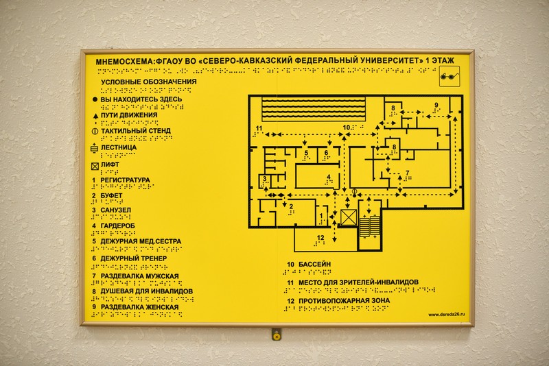 Мнемосхемы, навигация внутри здания. Общий план и схема движения по помещению отображается на специальном тактильном табло – мнемосхеме. Она сочетает в себе плоско-выпуклые элементы и надписи, выполненные шрифтом Брайля.