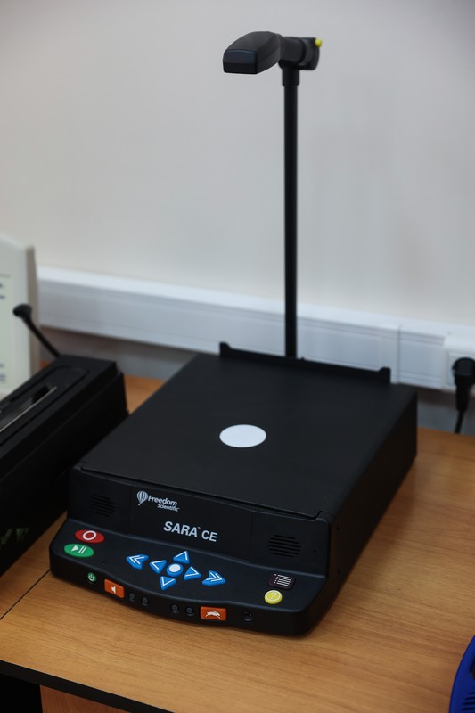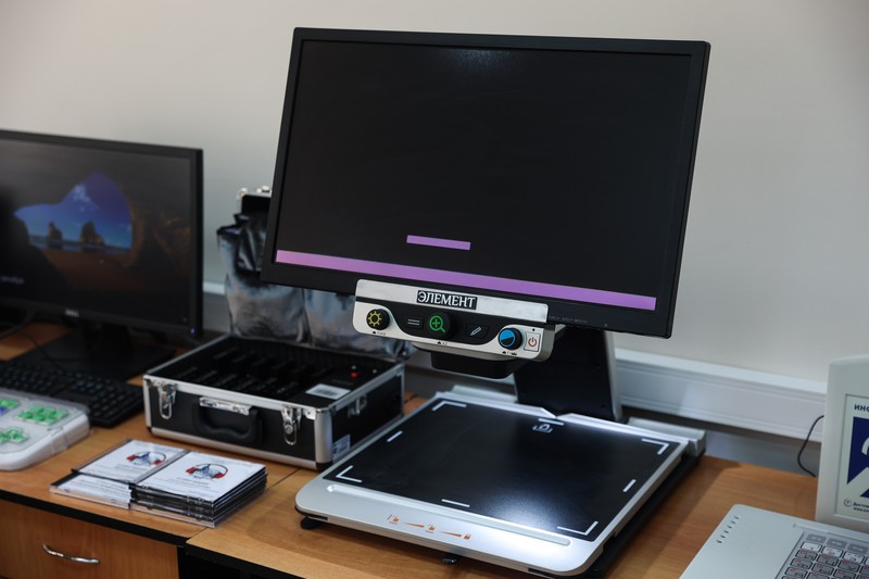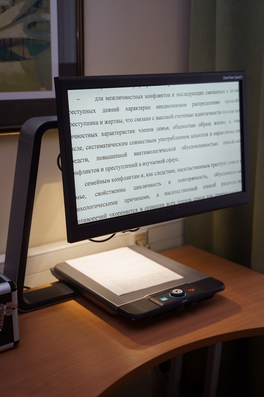 Электронный видеоувеличитель с режимами видеоувеличения, выделения строки, изменения цвета и контраста, просмотра и сохранения изображений (в т.ч. на внешний носитель). Большой экран, возможность регуляции положения габаритных текстов, изображений для работы. Стационарное устройство.