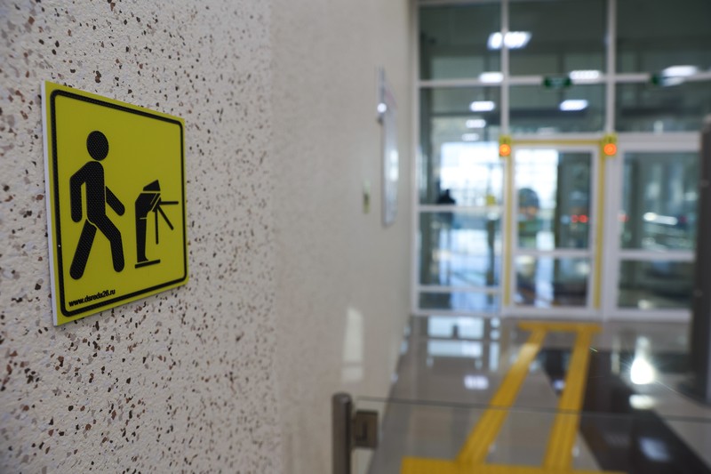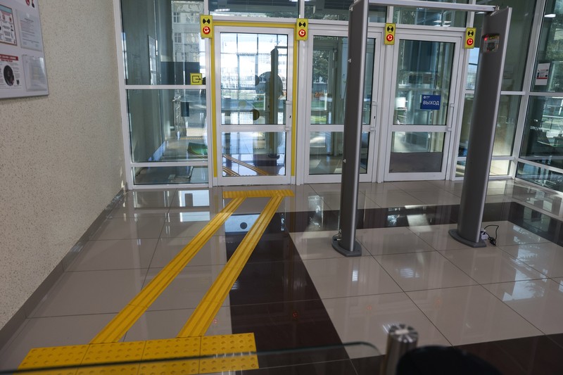Входная группа внутри здания оборудована специальным проходом для людей с ОВЗ, также дверной проем имеет желтую полосу по контуру, оснащен предупредительной тактильной разметкой. Тактильные таблички обозначают навигацию внутри здания.
