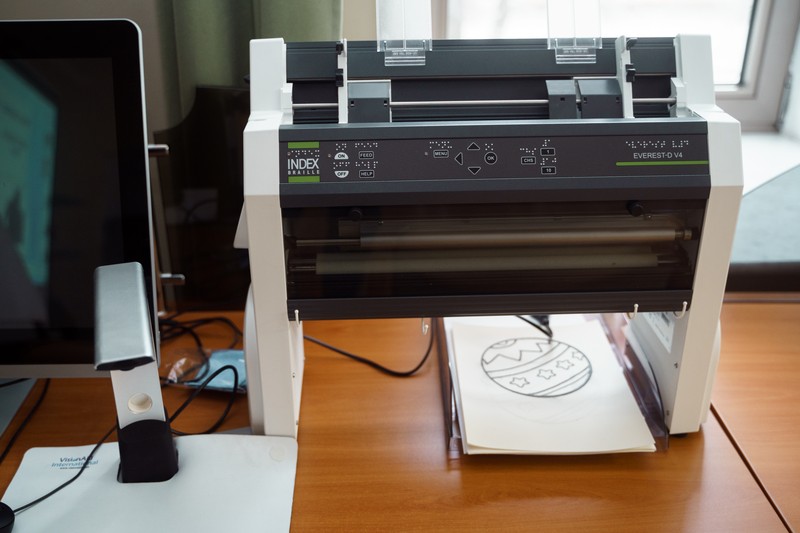 Принтер для печати рельефно-точечным шрифтом Брайля (Index Everest) – устройство вывода информации (в комплекте с ПО (DBT), ПК, специальной бумагой) для лиц с нарушениями зрения, владеющих азбукой Брайля (чтение, письмо). Выводит текст шрифтом брайля. Стационарное устройство с возможностью перемещения.