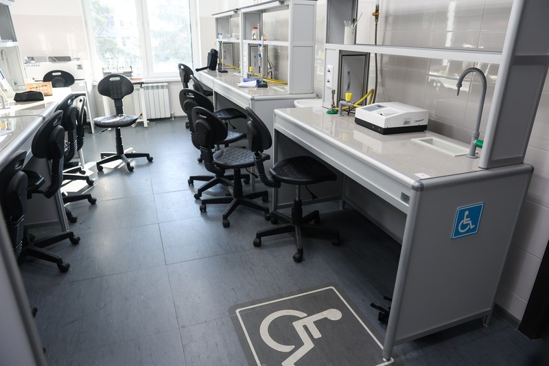 Лабораторные места для людей с ОВЗ оборудованы более широкими столами и маркированы разметками на полу и на мебели.