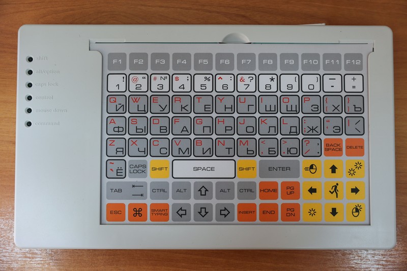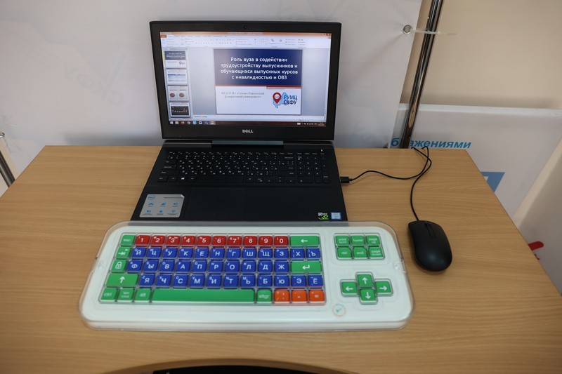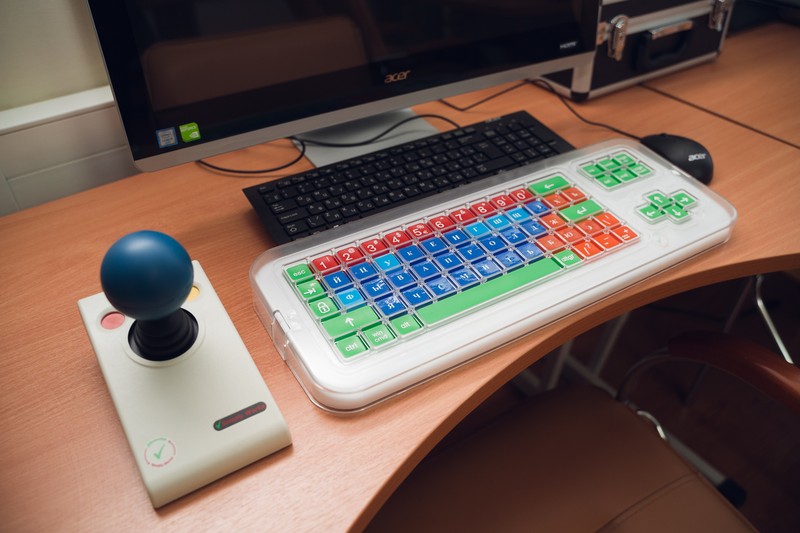Рабочее (учебное) место для обучающихся с ОВЗ и инвалидностью, оборудованное специальной клавиатурой. Клавиатура CIevy с укрупненными цветными кнопками (+ресивер) и пластиковой накладкой-разделителем клавиш (для работы лиц с нарушениями моторики и зрения). Стационарное устройство с возможностью перемещения. Обеспечивает многофункциональность использования и позволяет осуществлять работу с текстом, таблицами, калькулятором, веб-браузерами и другими приложениями. Стационарное устройство с возможностью перемещения.