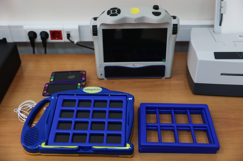 Оборудование рабочих (учебных) мест для лиц с нарушениями функции зрения и речи. 1.Электронное устройство преобразования текста в речь, предназначенное для лиц с нарушением зрения (читающая машина) Аура. Увеличивает и сканирует текстовые и графические изображения. Обеспечивает функцию сканирования и воспроизведение текста вслух встроенным синтезатором речи. Портативное устройство. 2. Электронное устройство преобразования текста в речь Eye-Pal Ace, предназначенное для лиц с нарушением зрения (читающая машина). Портативное устройство 2.Электронный видеоувеличитель ЭРВУ Визор-1 с режимами видеоувеличения, выделения строки, изменения цвета и контраста, чтения, просмотра и сохранения изображений. Портативное устройство. 3.Коммутатор. Позволяет осуществлять процесс коммуникации с категорией обучающихся, имеющих проблемы речи или собственно коммуникации (напр., РАС). Развивающий конструктор позволяет записывать и воспроизводить голосовые сообщения. Стационарное устройство с возможностью перемещения.