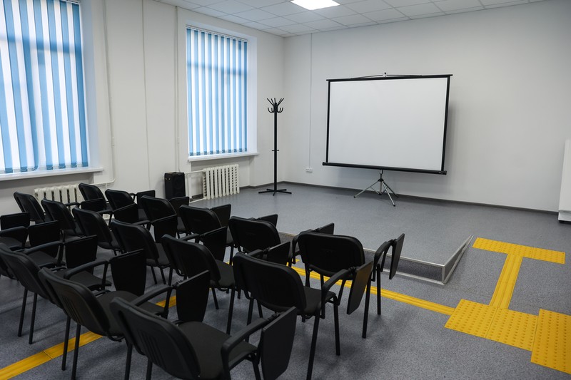 Инклюзивный коворкинг профессиональных и образовательных инициатив. Помещение площадью 144 кв.м., включающее конференц-зону и зону интерактивной площадки «Территория взаимопонимания». Конференц-зона включает 70 посадочных мест.