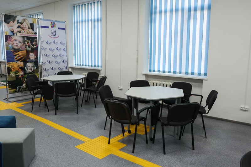 Инклюзивный коворкинг профессиональных и образовательных инициатив оснащен специальной модульной мебелью. Включает 10 индивидуальных рабочих мест (для единовременной работы с использованием переносной оргтехники)