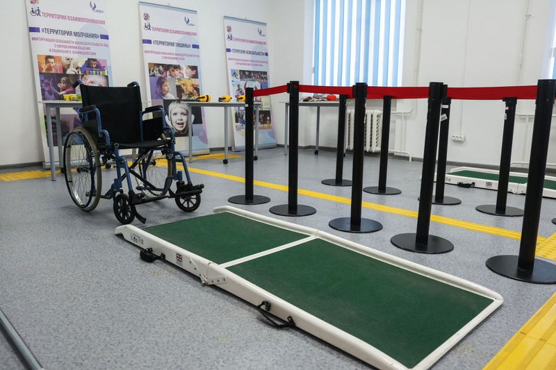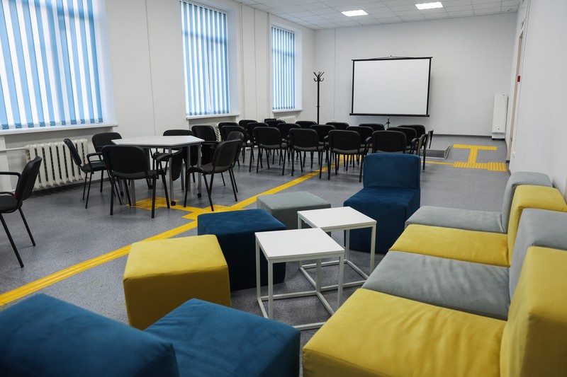 Инклюзивный коворкинг профессиональных и образовательных инициатив оснащен тактильной разметкой, индукционной петлей, компьютерной техникой и комплектующими, а также беспроводной сетью wi-fi.